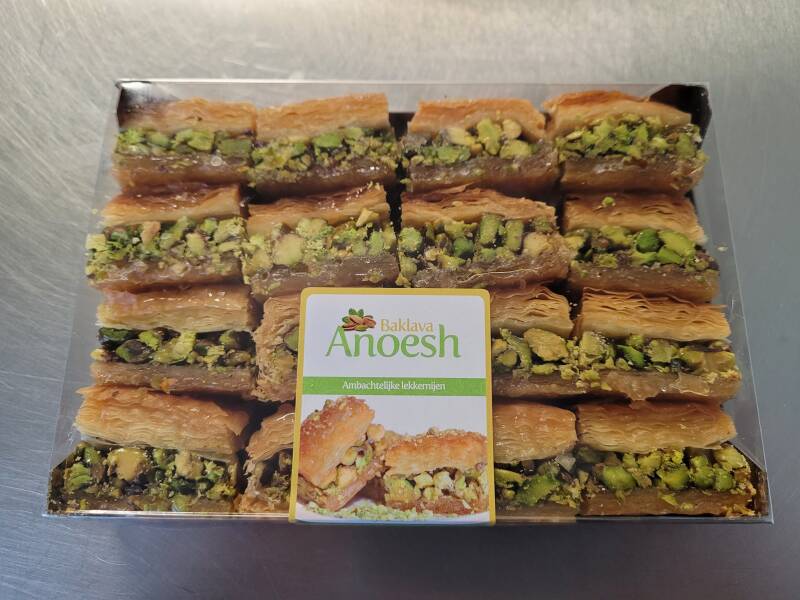 Onze baklava wordt op ambachtelijke wijze bereid. Deze lekkernij bestaat uit laagjes filodeeg met een vulling van verschillende soorten noten, zoals pistachenoten en walnoten. Onze baklava is van hoge kwaliteit. Zo gebruiken wij echte roomboter. De baklava wordt in een steenoven gebakken. Onze baklava is minder zoet en staat bekend om zijn knapperige structuur