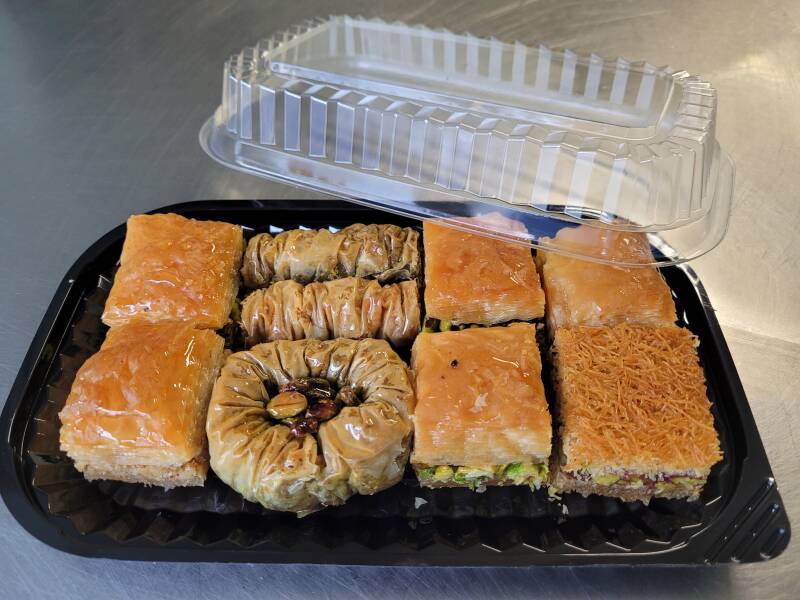 Baklava gevuld met pistachenoten. Bakje 8st. €5,50 en 2 bakjes voor €10.